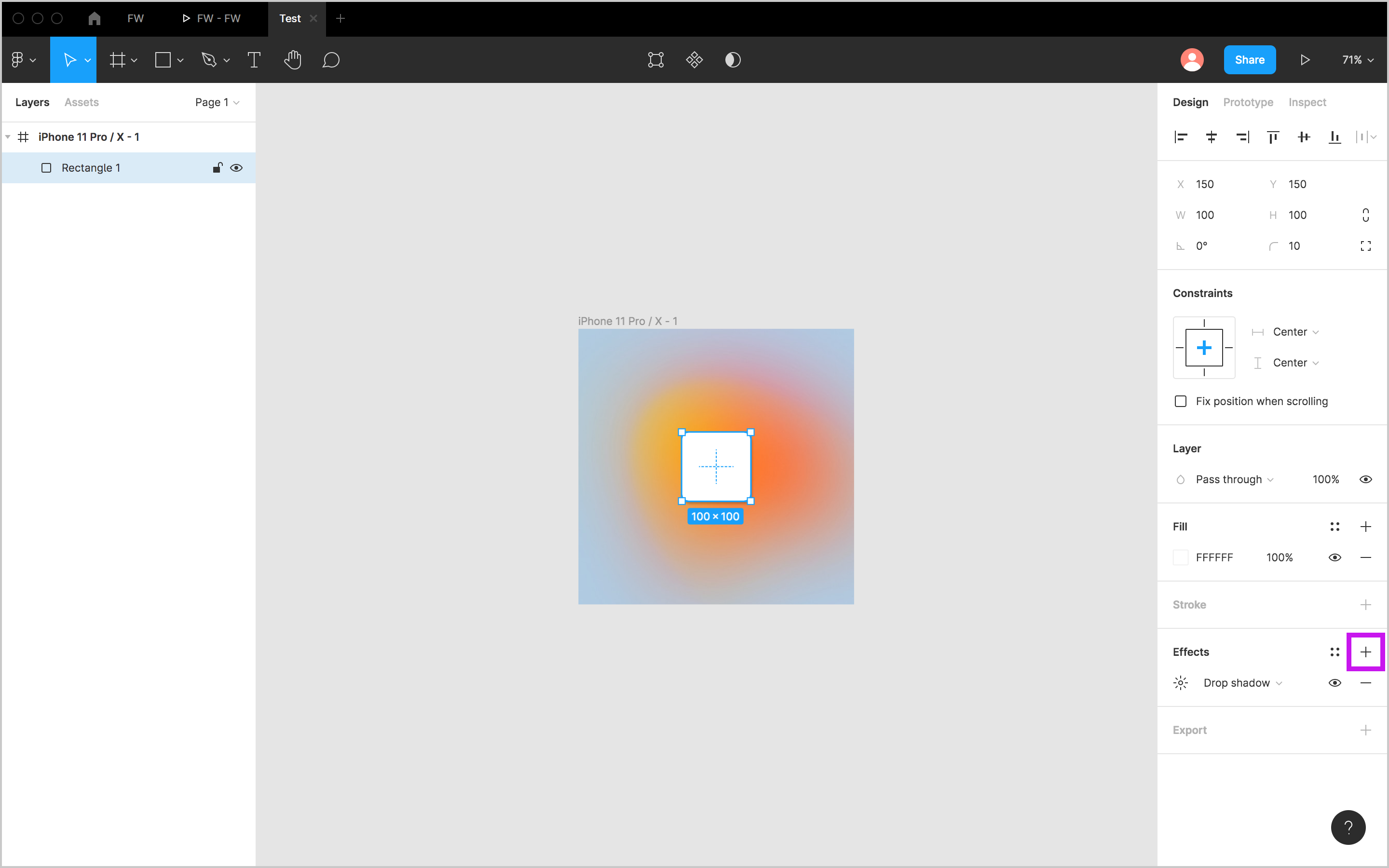 피그마에서 그림자 효과를 추가하는 방법은 간단하다. 그림자를 넣고 싶은 레이어를 선택 후 오른쪽 디자인 패널에서 아래와 같이 추가하면 된다.