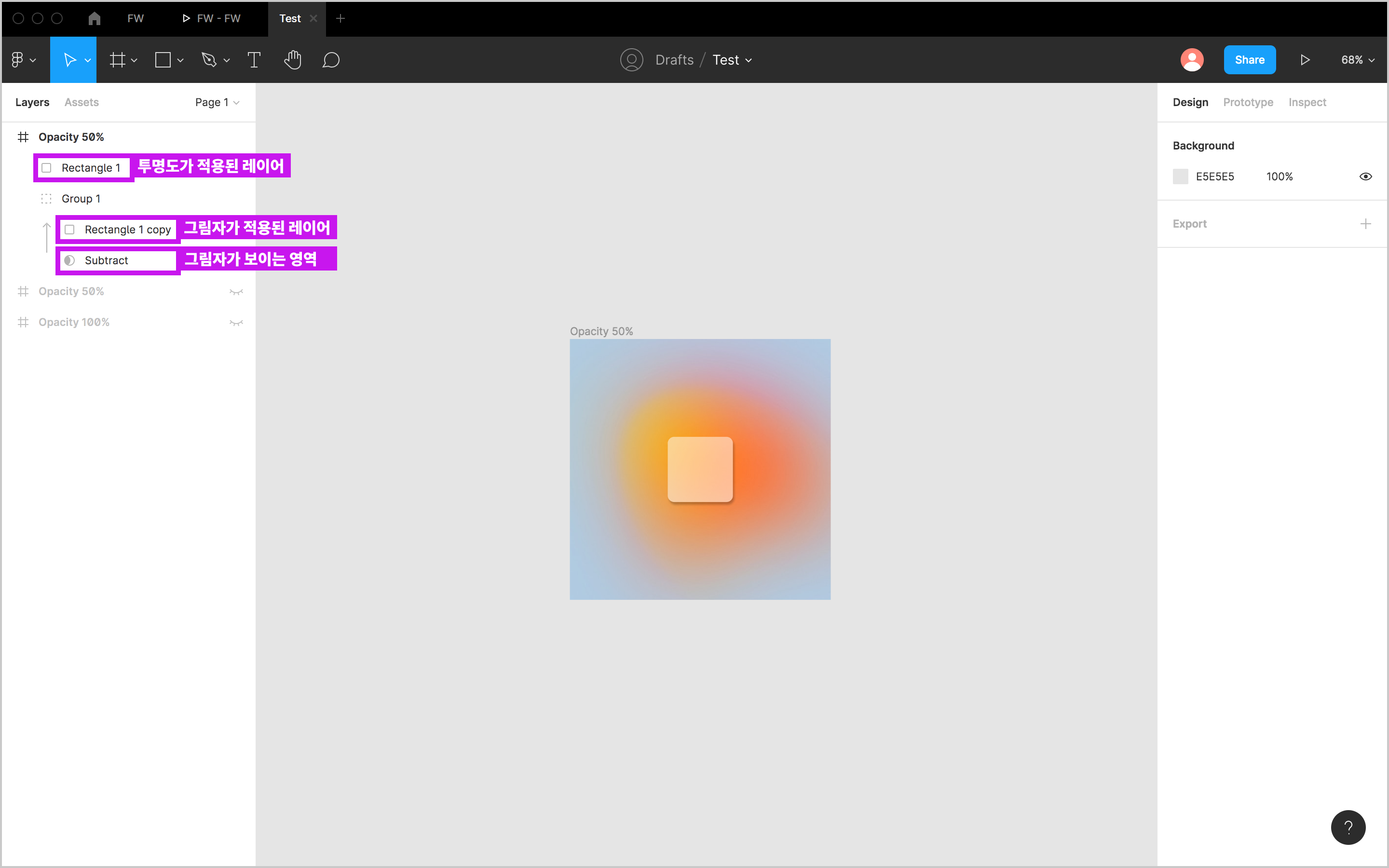 문제는 그림자를 추가한 레이어의 불투명도(Opacity)가 100% 로가 아닌 경우로 적용해 본 사람이라면 알겠지만 아마 본인이 예상한 것과는 다르게 적용될 것이다. 바로 아래 예시에서 볼 수 있듯이 투명한 레이어에 그림자 효과를 추가하면 두 번째 이미지처럼 레이어 뒤로 그림자 효과가 비춰보여 투명한 레이어가 오히려 탁해 보이는 현상이 생기는 것이다. (왜 피그마는 그림자 효과가 이렇게 적용되게 만들었을까요...)